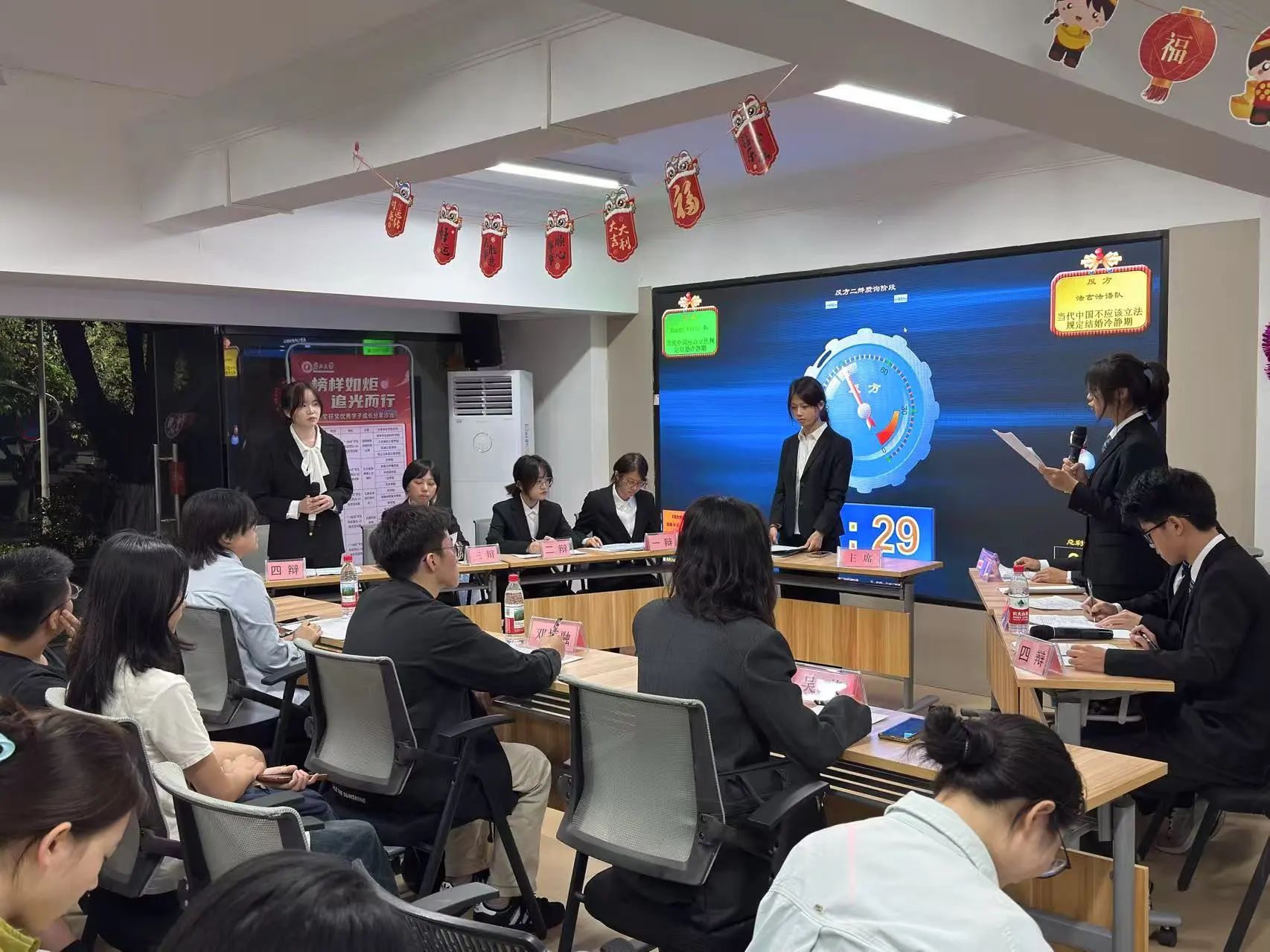 比赛开始后,双方辩手围绕辩题展开激烈交锋。正方辩手立足社会现实,指出近年来我国闪婚闪离现象频发,立法设立结婚冷静期能帮助青年理性审视婚姻承诺,减少草率婚姻带来的家庭矛盾,论证了结婚冷静期制度的正当性。反方辩手则从法理与人权角度展开攻势,强调婚姻自由不可侵犯,设立结婚冷静期可能造成“程序异化”,与国家政策导向相违背,立场鲜明地表达了观点。正反方你来我往,针锋相对,现场气氛紧张热烈,掌声此起彼伏。